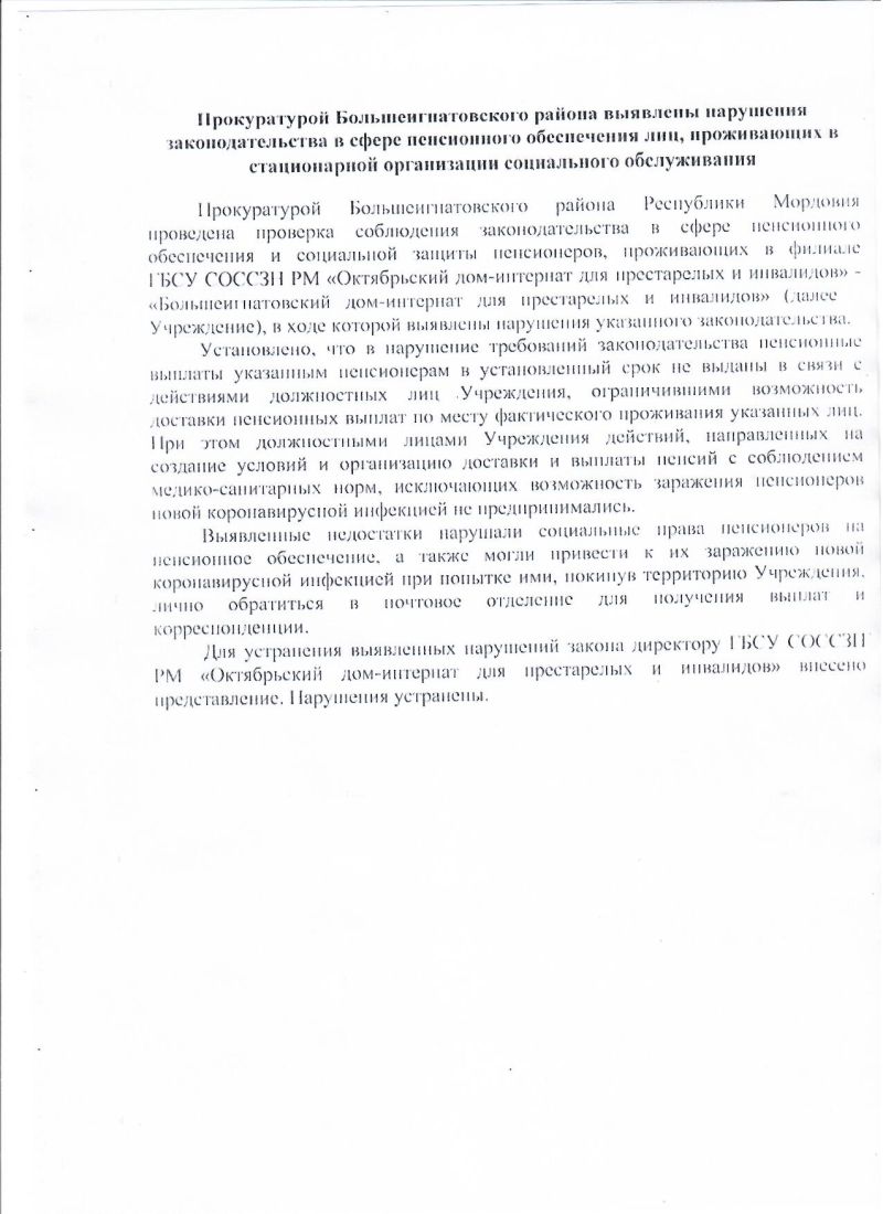 Прокуратурой Большеигнатовского района выявлены нарушения законодательства в сфере пенсионного обеспечения лиц, проживающих в стационарной организации социального обслуживания