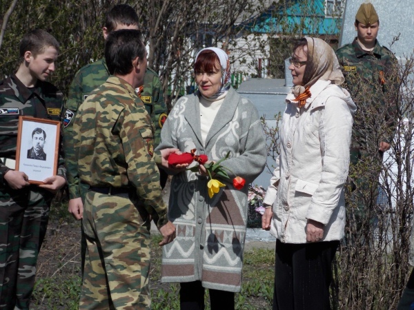 Руководитель поискового отряда школы Кечемайкин В.М. передает землю взятого с братской могилы внукам, невернувшегося с полей сражений солдата Куманева П.Ф.
