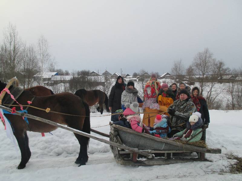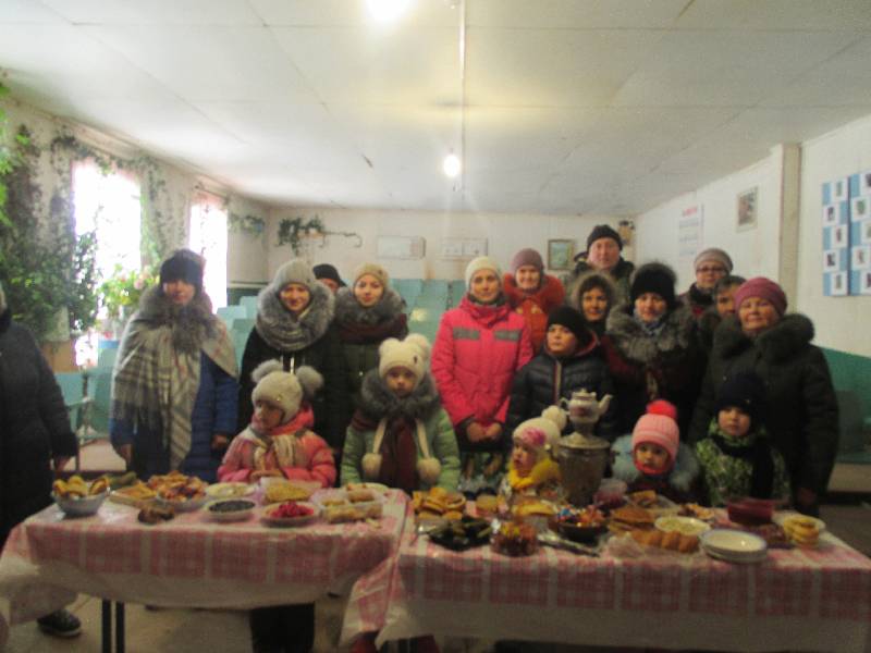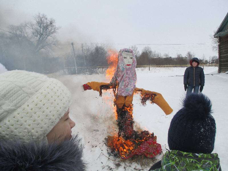 Затем по традиции со словами : «Прощай зима, здравствуй весна» было сожжено чучело зимы. Празднование закончилось угощением блинами.