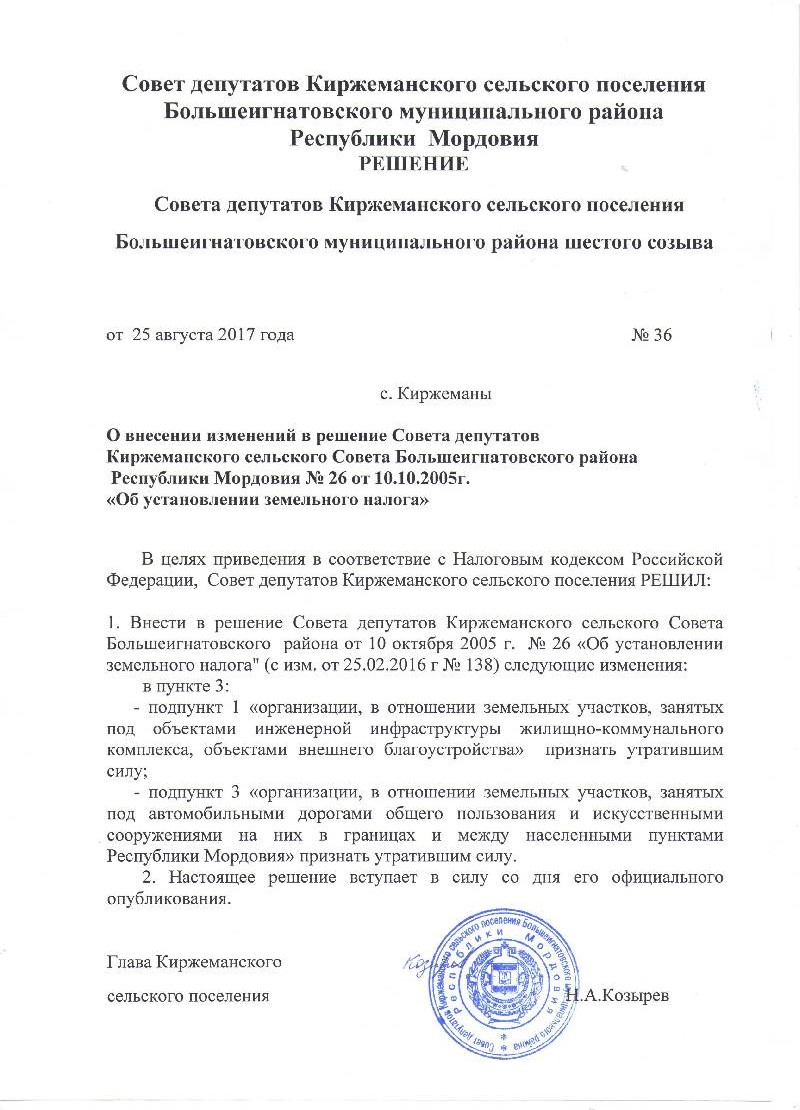 Решение совета депутатов от 25 августа 2017 №36 О внесении изменений в решение Совета депутатов Киржеманского сельского совета Большеигнатовского района Республики Мордовия №26 от 10.10.2005г. "Об установлении земельного налога"
