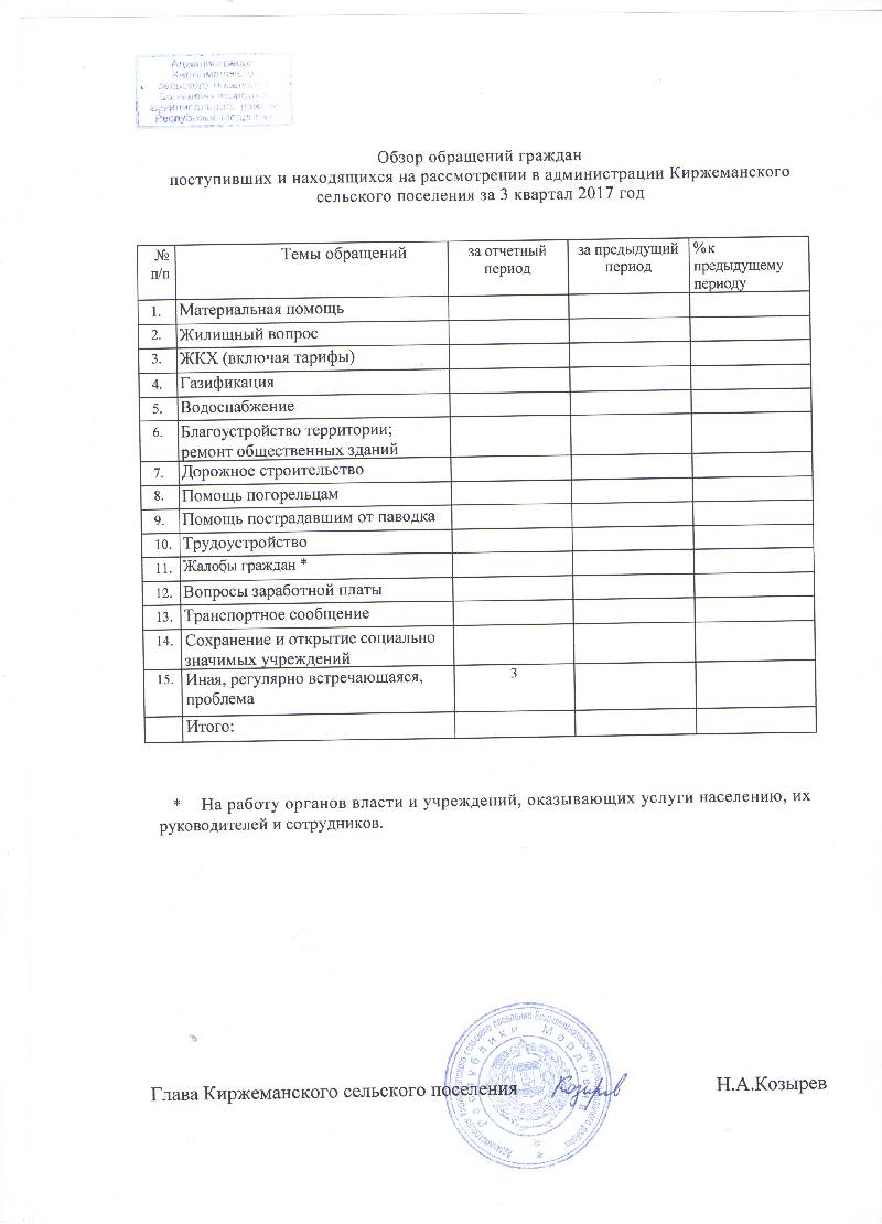 Обзор обращений граждан, поступивших и находящихся на рассмотрении в администрации Киржеманского сельского поселения за 3 квартал 2017 года